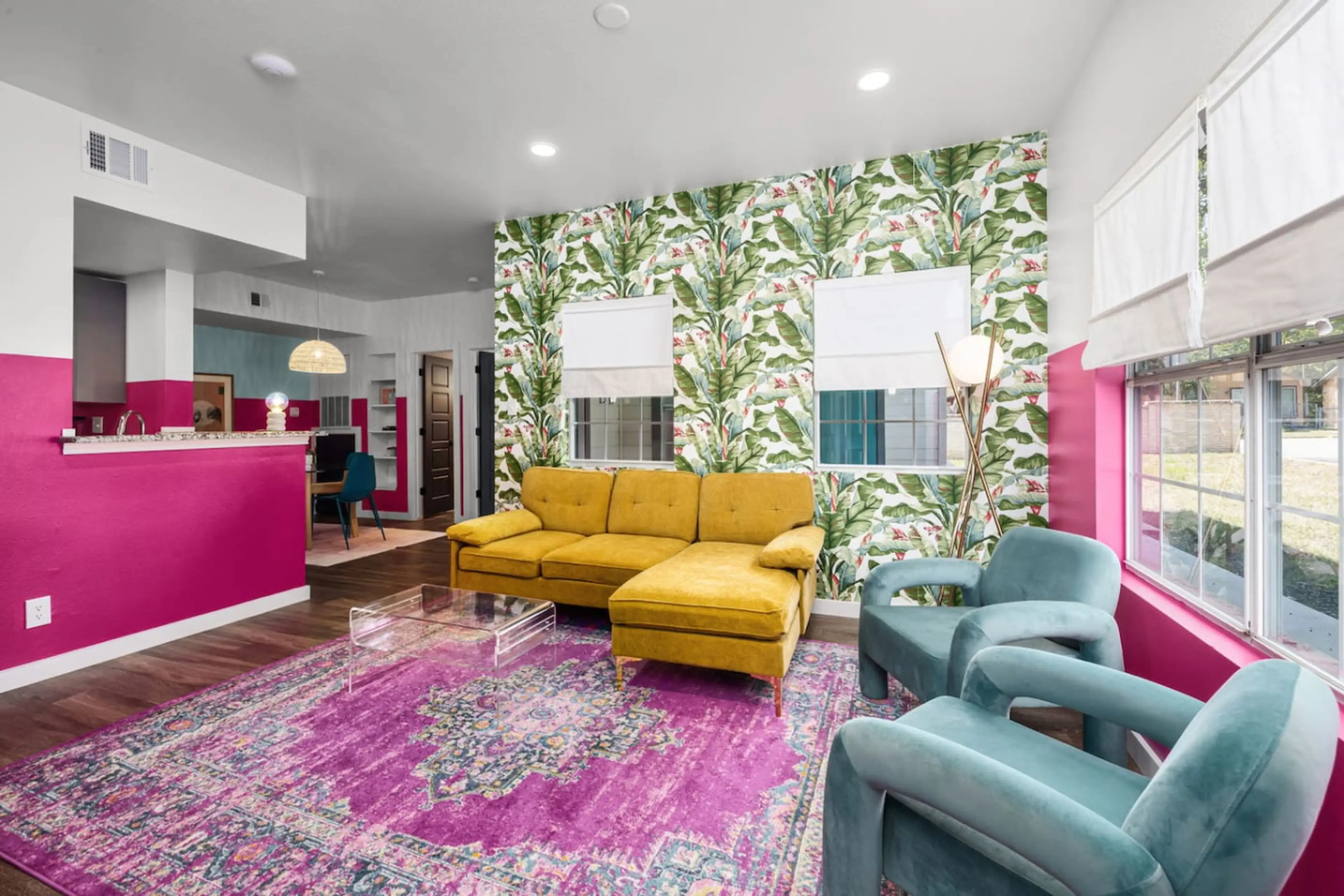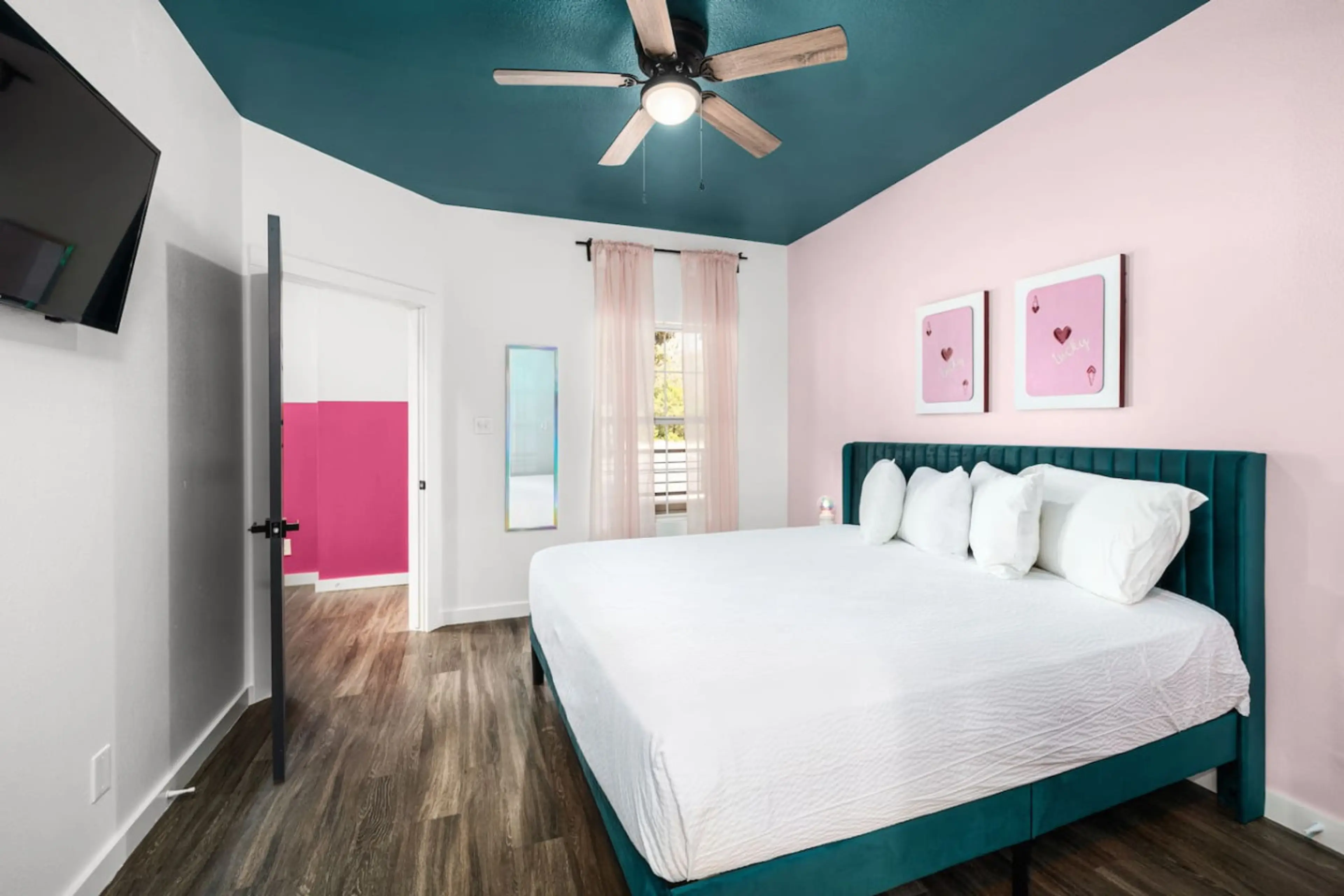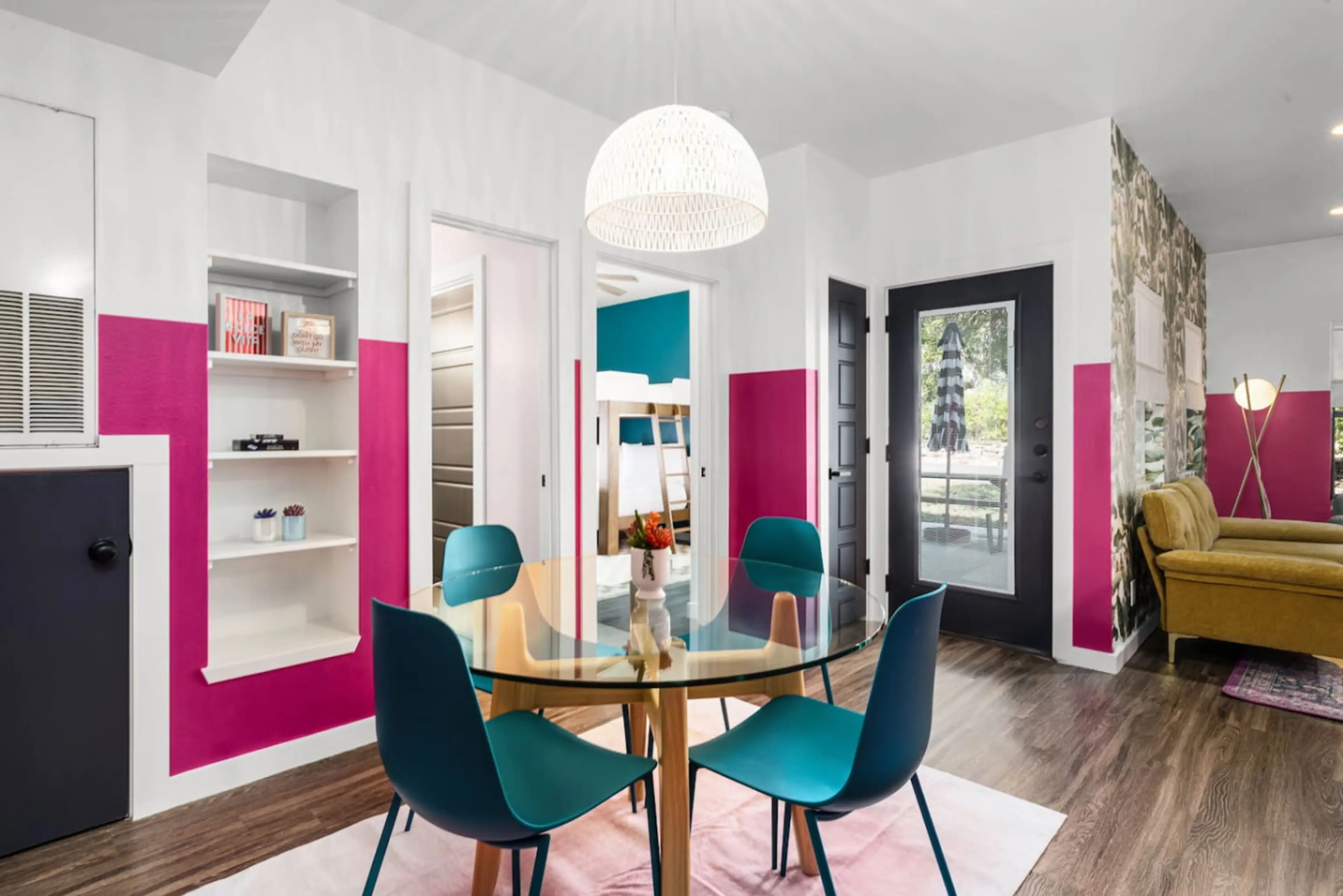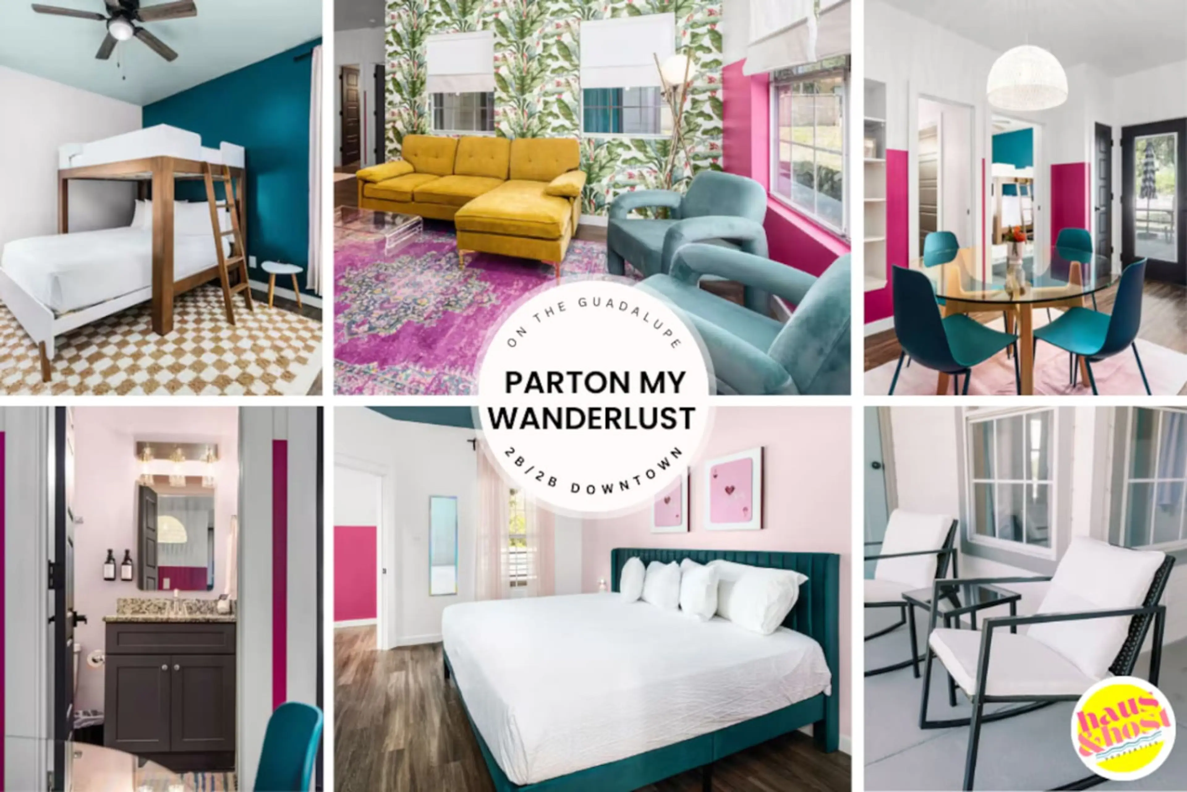 Welcome to Parton my Wanderlust! A Dolly Parton–inspired 2BR/2BA retreat on the Guadalupe River in the heart of New Braunfels. Featuring 2 ensuite baths—1 with a king bed, the other with an XL full over queen bunk. Bold paint, statement wallpaper, heart-shaped neon, and rhinestone-studded velvet t...