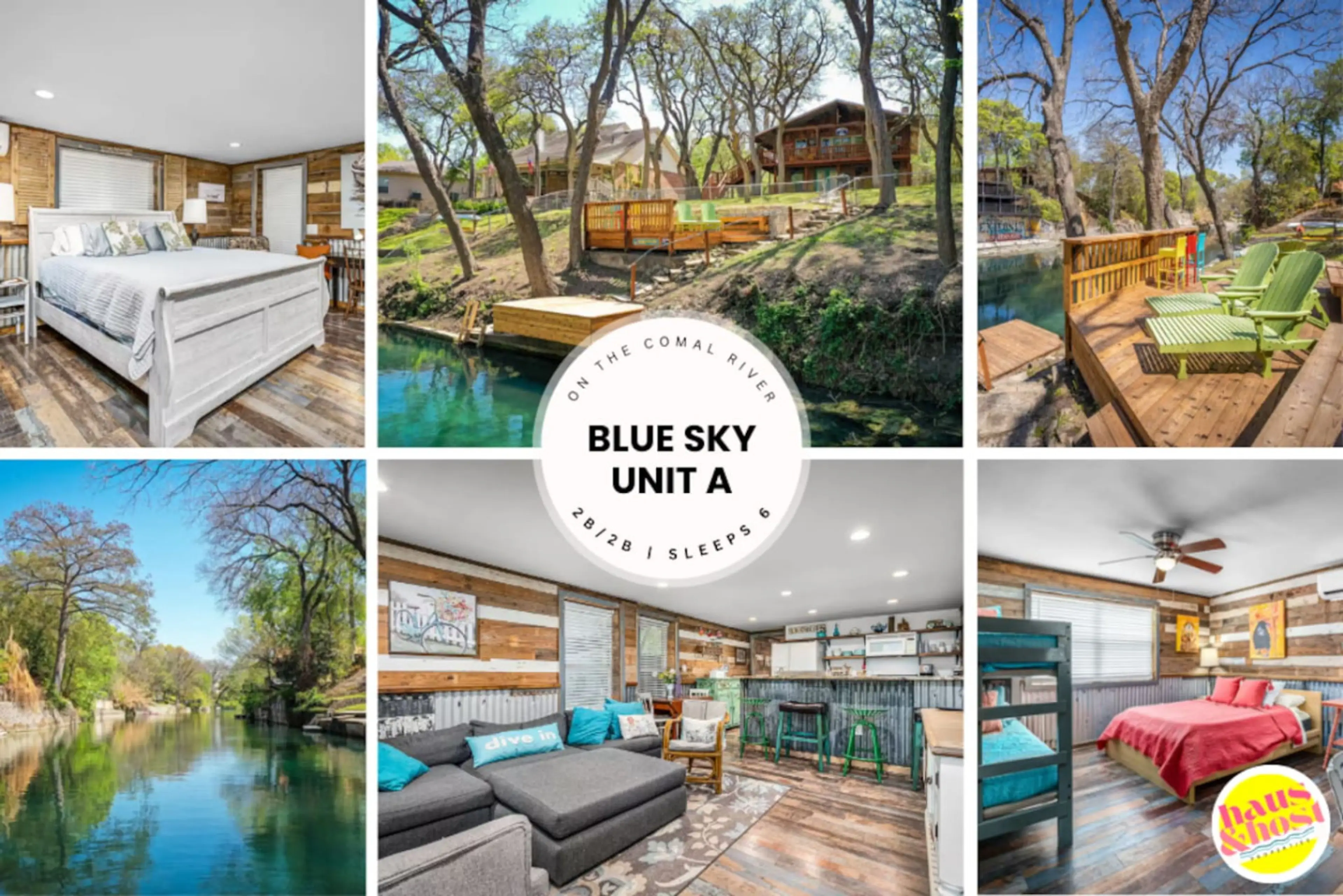 Welcome to Blue Sky! This is the downstairs level of this iconic 2-story Comal River home. Featuring 2 bed and 2 baths, a full kitchen, and cozy living space, it’s ideal for families or friends ready to make the river their backyard. Step outside to the shaded yard and private deck directly on the ...